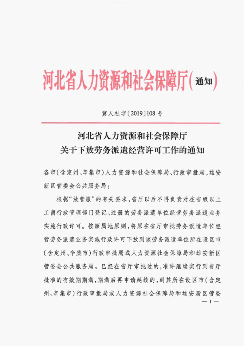 河北省人力资源和社会保障厅近日发布关于下放劳务派遣经营许可工作的通知。