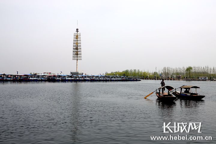 春光降临,芦芽竞出,满淀碧翠。偶见打渔人划着木船徜徉于水中。
