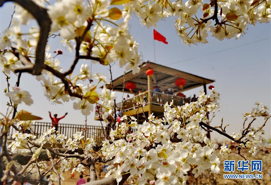 4月6日,游客在肃宁县万里镇尹庄村梨园观光台上赏花。新华社记者杨世尧摄
