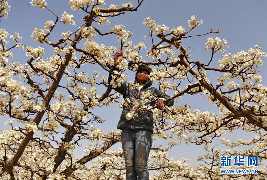 4月6日,肃宁县窝北镇刘家前头村的梨农为梨花授粉。新华社记者杨世尧摄