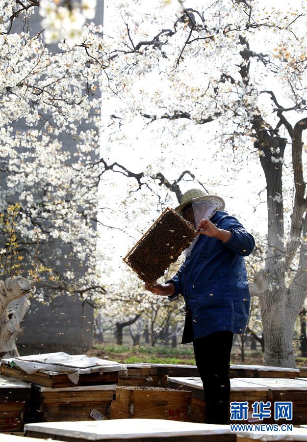 4月5日,在河北石家庄赵县谢庄乡安家庄村,农民利用蜜蜂为梨花授粉。 清明时节,各地农民抢抓农时开展农事作业。新华社发(梁子栋 摄)