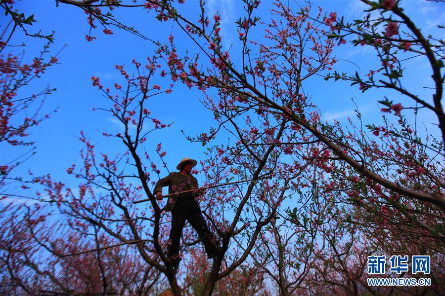 4月5日,山东省临沂市平邑县地方镇辛庄村农民在桃园里修剪桃树。清明时节,各地农民抢抓农时开展农事作业。新华社发(武纪全 摄)
