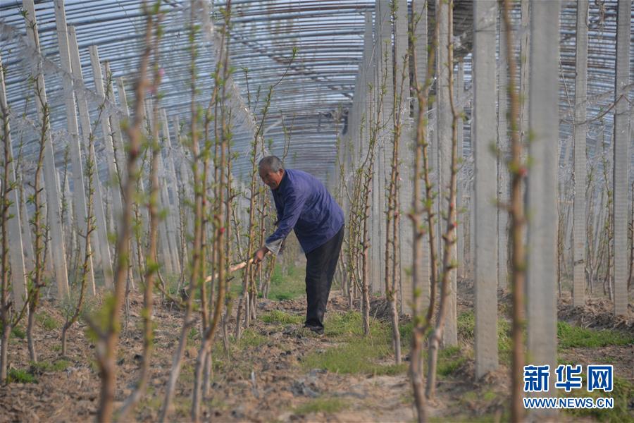 4月5日,山东省聊城市茌平县贾寨镇后寨村农民在大棚里为桃树锄草。清明时节,各地农民抢抓农时开展农事作业。新华社发(赵玉国 摄)