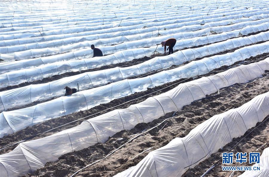 4月5日,河北石家庄新乐市岸城村农民在田间管护小棚西瓜。 清明时节,各地农民抢抓农时开展农事作业。新华社发(贾敏杰 摄)