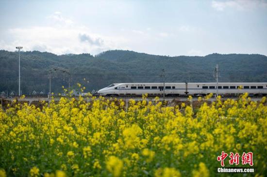资料图:高铁列车穿行在油菜花间。中新社发 吴德军 摄 图片来源:CNSPHOTO