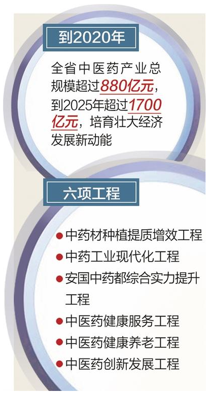 根据我省中医药资源分布、中药材种植、中药工业、中药商贸流通、相关健康产业等发展现状,以及中医药产业面临的形势和任务,我省将重点实施六项工程,以促进中医药产业全面发展,实现跨越提升。