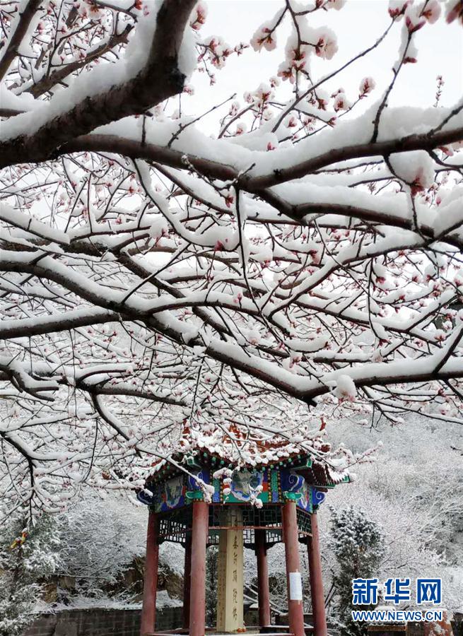 这是4月9日拍摄的张家口鸡鸣山景区雪景。当日,受较强冷空气影响,河北张家口迎来降雪。新华社发(郝少清 摄)