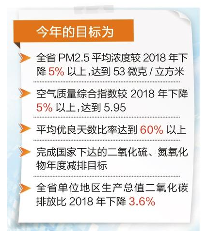 河北省大气污染防治工作领导小组日前印发《河北省2019年大气污染综合治理工作方案》提出,今年我省将推进大气污染综合治理走深走实走细,确保打赢蓝天保卫战。今年的目标为:全省PM2.5平均浓度较2018年下降5%以上,达到53微克/立方米;空气质量综合指数较2018年下降5%以上,达到5.95;平均优良天数比率达到60%以上;完成国家下达的二氧化硫、氮氧化物年度减排目标;全省单位地区生产总值二氧化碳排放比2018年下降3.6%。