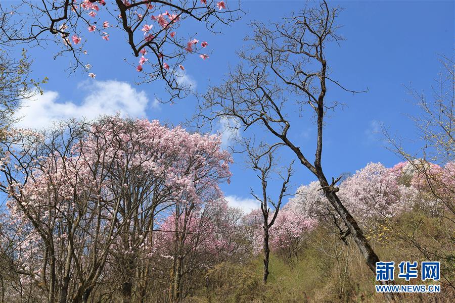 四川省江油市大康镇旱丰村吴家后山,盛开的辛夷花与错落有致的树干、蓝天构成一幅画卷(4月9日摄)。新华社记者 江宏景 摄