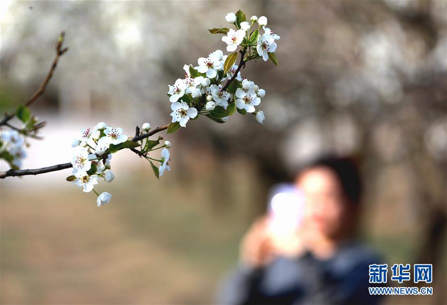 4月10日,游客在河北省固安县东湖庄村的梨园内赏花踏青。固安县的近万亩梨园的梨树已迎来盛花期。新华社记者 王晓 摄