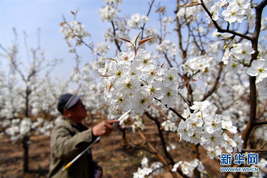 4月10日,山西省祁县古县镇闫漫村村民为梨花授粉。随着天气回暖,山西省祁县15.7万亩梨花陆续绽放,当地果农忙碌着为梨花授粉,不少游客也前来踏青赏花。新华社记者 詹彦 摄
