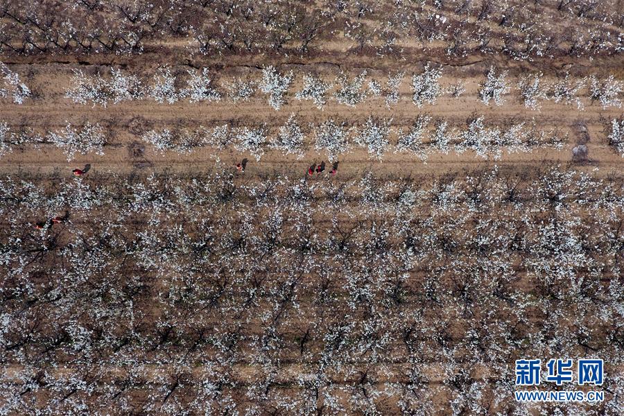 4月10日,游人在山西省祁县古县镇闫漫村赏花(无人机拍摄)。随着天气回暖,山西省祁县15.7万亩梨花陆续绽放,当地果农忙碌着为梨花授粉,不少游客也前来踏青赏花。新华社记者 詹彦 摄