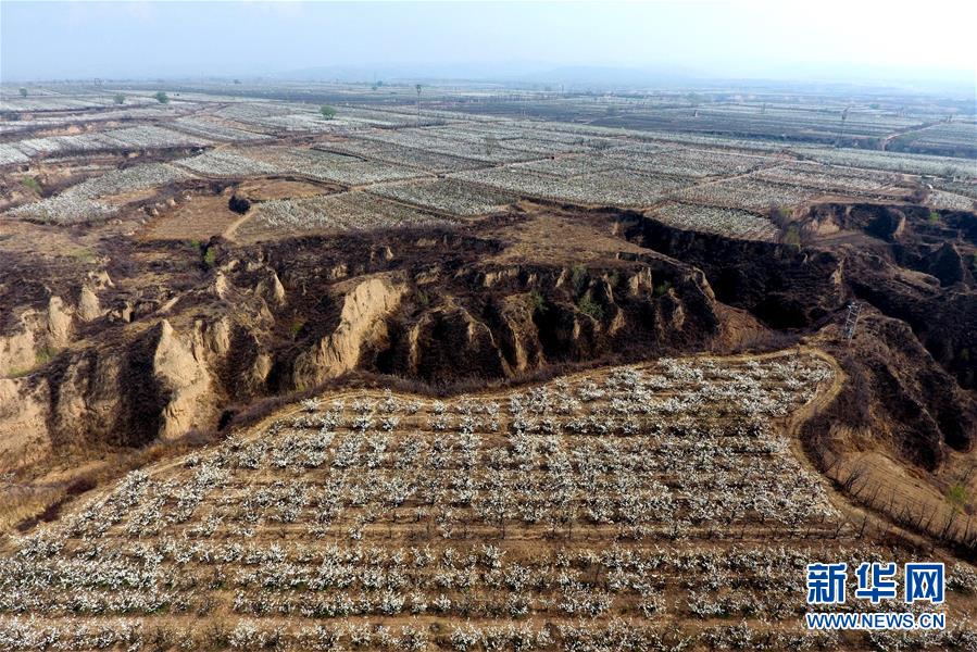 山西省祁县古县镇境内的景色(4月10日无人机拍摄)。随着天气回暖,山西省祁县15.7万亩梨花陆续绽放,当地果农忙碌着为梨花授粉,不少游客也前来踏青赏花。新华社记者 詹彦 摄