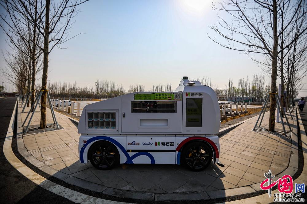 在园区内停放的白色新石器无人自动售货机。无人自动售货机上写着“无人驾驶,全球送达”,货架上可以看到摆放着农夫山泉、红牛等饮料。记者郑亮 摄