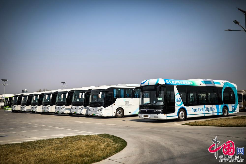 雄安市民服务中心在设计建造时突出“绿色、现代、智慧”理念。2018年4月28日,园区宣布禁止燃油车驶入。所有前往服务中心游览的市民需要在容和塔附近的停车场乘坐新能源摆渡车进入到内部参观。记者郑亮 摄