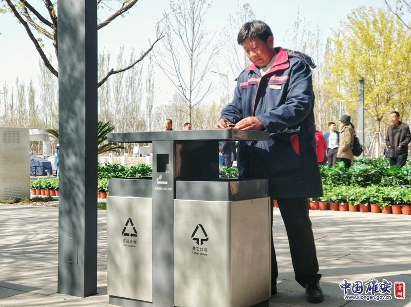 环卫工人在擦拭垃圾桶。中国雄安官网记者李鑫 摄