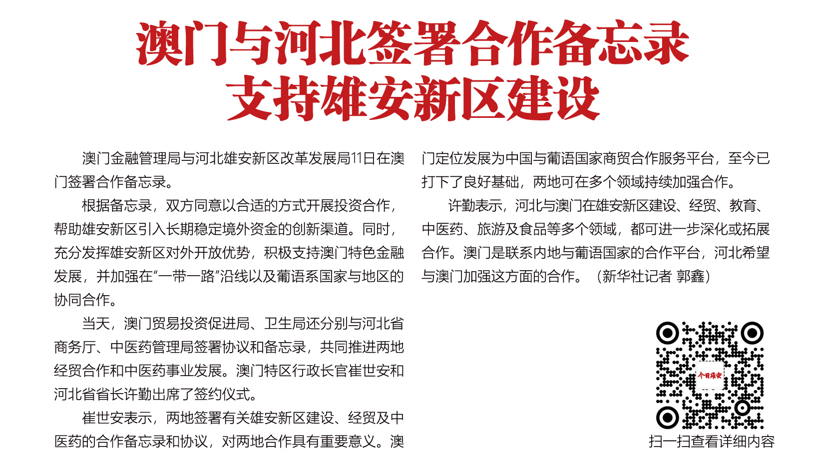 澳门金融管理局与河北雄安新区改革发展局11日在澳门签署合作备忘录。