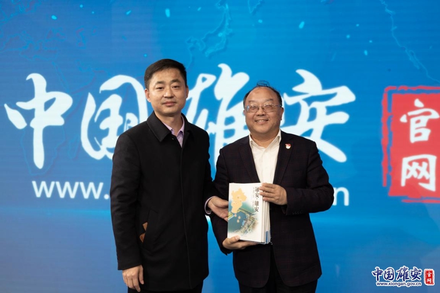 省委网信办应急指挥中心主任、应急管理和舆情处处长、雄安新区网信办主任李长斗向何继良赠送《雄安,雄安》。中国雄安官网记者毛鹤然 摄