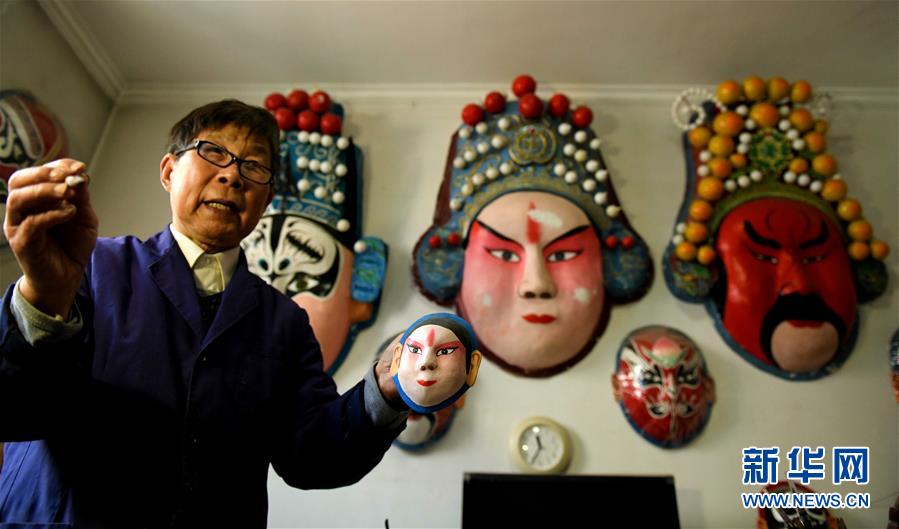 4月12日,张智在家中介绍脸谱创作过程。82岁的老艺人张智是河北省石家庄市新华区一名退休干部,退休后开始学习脸谱手工制作技艺,在25年时间里完成制作京剧脸谱千余张。近年来,张智走进社区、学校和企事业单位传授脸谱制作技艺,让更多的人了解这门艺术,感受传统民族文化的魅力。新华社发(陈其保 摄)