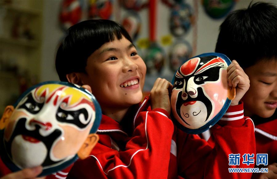 4月12日,在张智家中,一名小学生在体验脸谱制作技艺。82岁的老艺人张智是河北省石家庄市新华区一名退休干部,退休后开始学习脸谱手工制作技艺,在25年时间里完成制作京剧脸谱千余张。近年来,张智走进社区、学校和企事业单位传授脸谱制作技艺,让更多的人了解这门艺术,感受传统民族文化的魅力。新华社发(陈其保 摄)