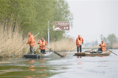 4月9日下午,白洋淀里的环卫工王老槐(左一)和同事们在湖面上打捞漂浮物。自雄安新区设立以来,白洋淀内的生态环境得到了明显改善。