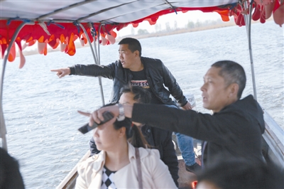4月2日,长年靠淀为生的王二猛带着游客参观白洋淀。