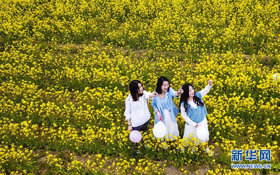 4月13日,游客在畅游油菜花海(无人机拍摄)。