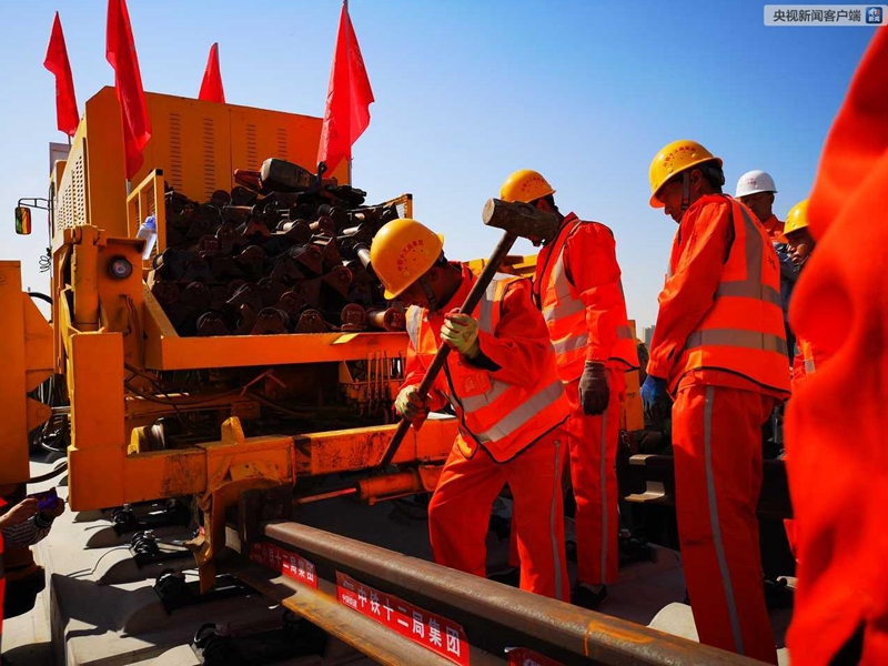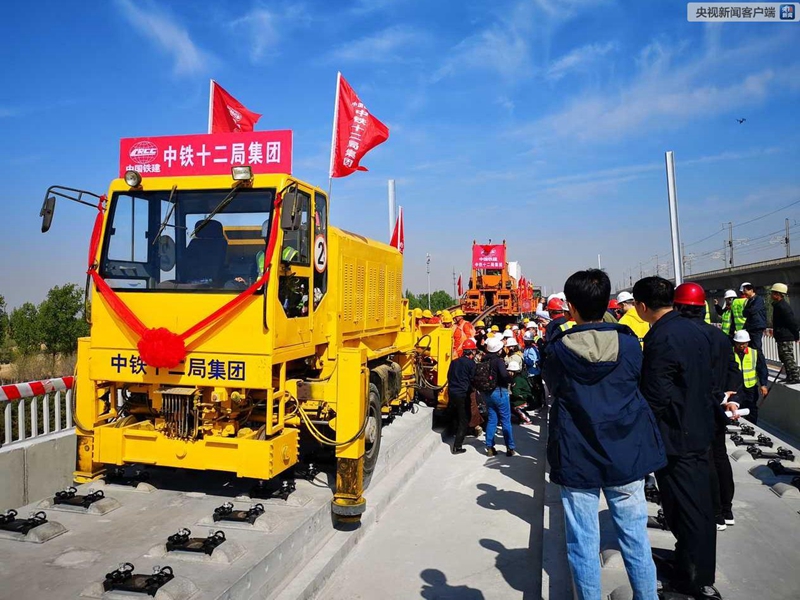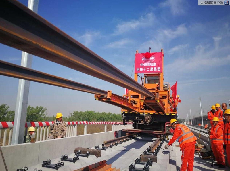 2019年4月15日上午9时28分,在北京至雄安新区城际铁路北京段——李营段施工现场,随着现场指挥人员一声令下,第一组500米长钢轨从T11运输车前端缓缓送出,平稳落在无砟道床上,标志着京雄城际铁路(北京段)建设整体从线下施工转入线上轨道铺设阶段,也意味着京雄城际铁路(北京段)建设进入最后冲刺阶段。