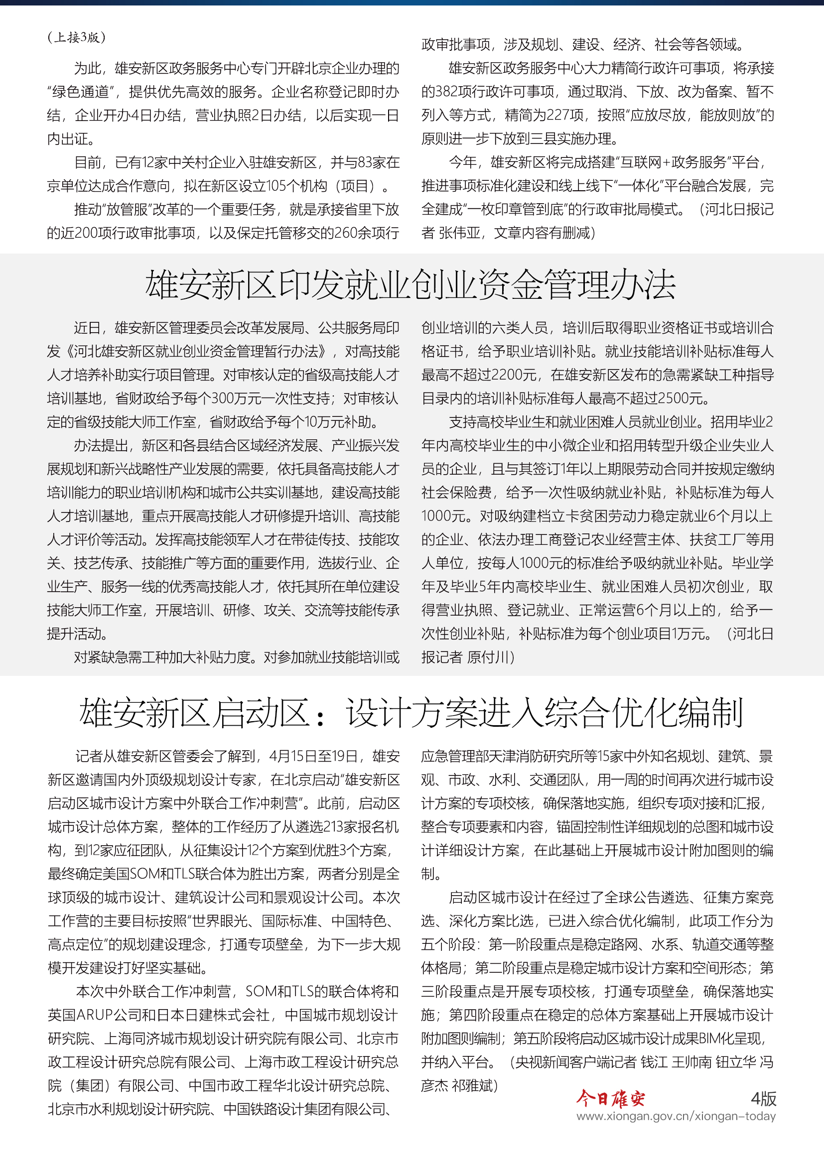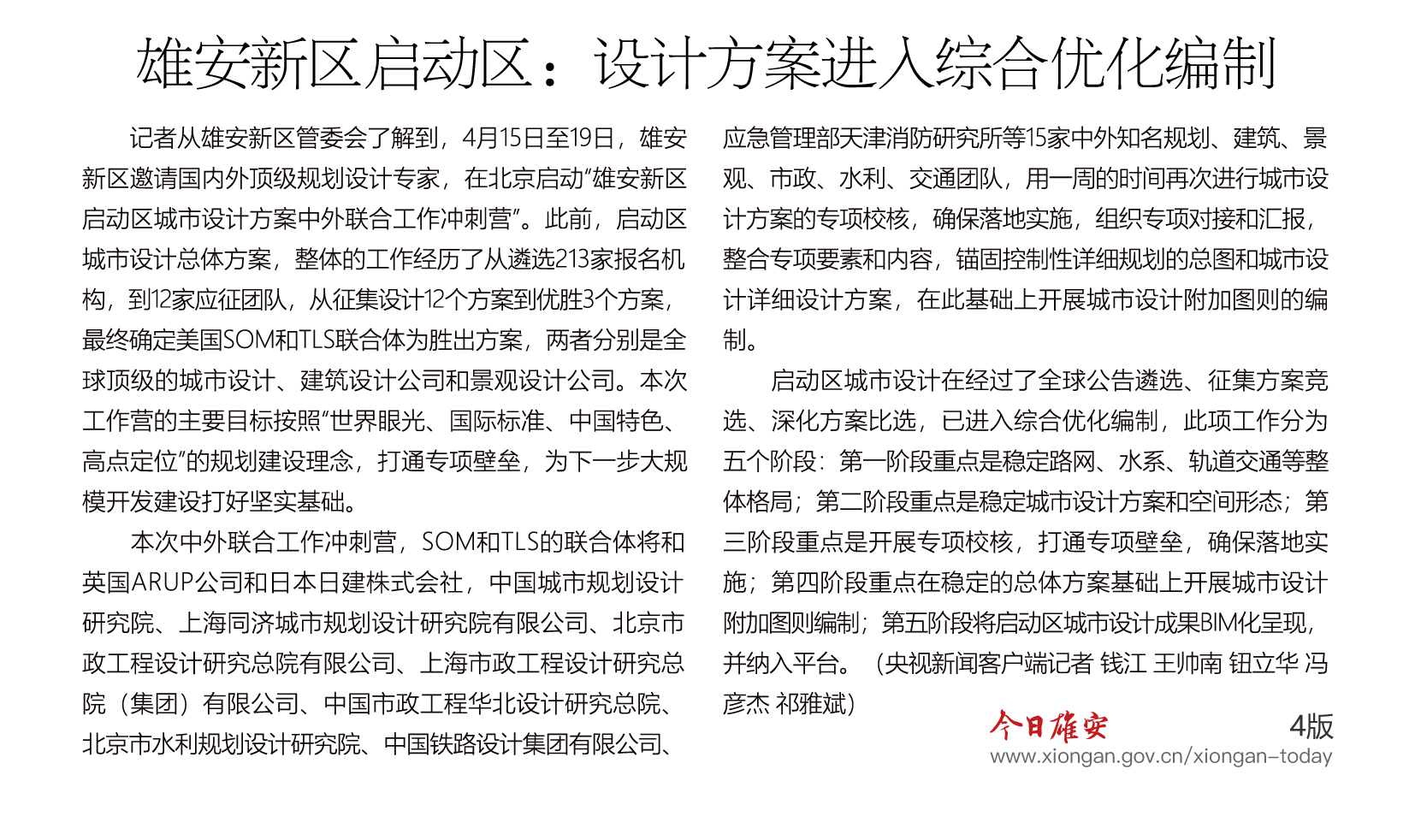 记者从雄安新区管委会了解到,4月15日至19日,雄安新区邀请国内外顶级规划设计专家,在北京启动“雄安新区启动区城市设计方案中外联合工作冲刺营”。
