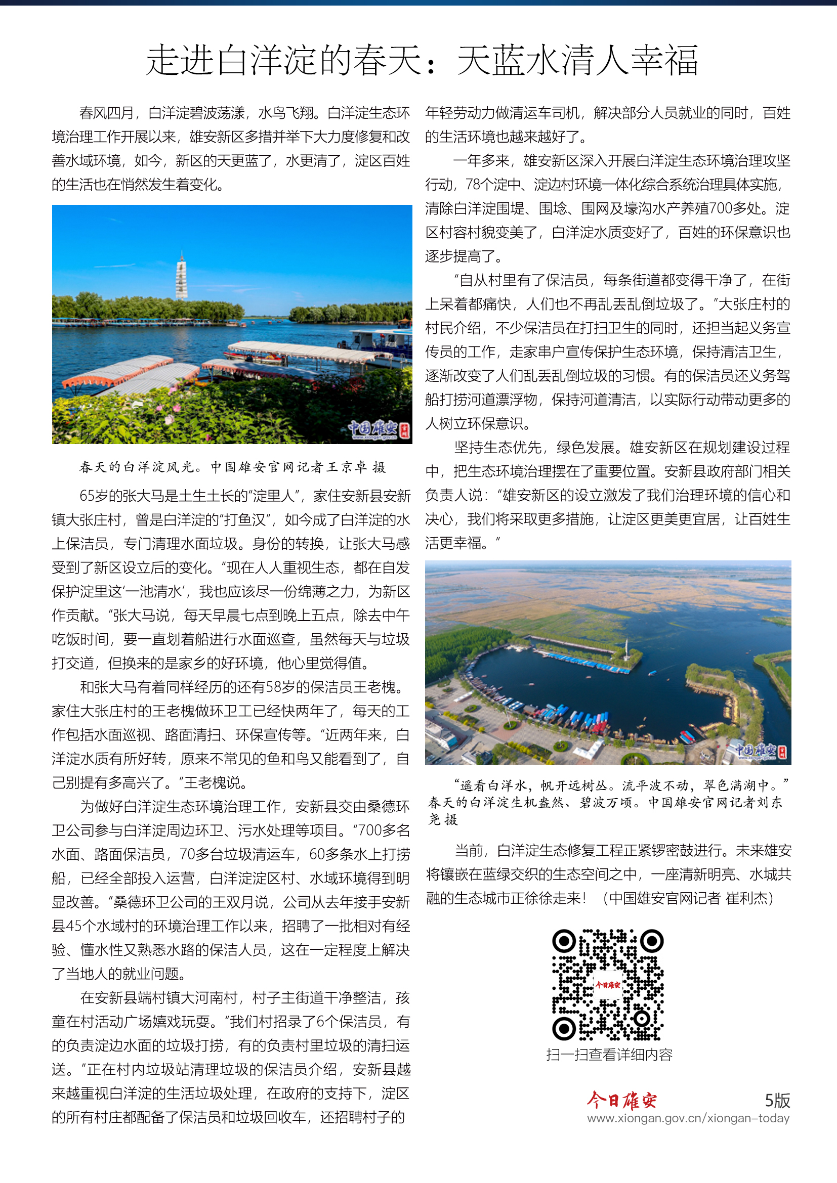 白洋淀生态环境治理工作开展以来,雄安新区多措并举下大力度修复和改善水域环境,如今,新区的天更蓝了,水更清了,淀区百姓的生活也在悄然发生着变化。