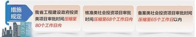 措施规定,我省工程建设政府投资类项目审批时间压缩至80个工作日内,核准类社会投资项目审批时间压缩至68个工作日内,备案类社会投资项目审批时间压缩至65个工作日以内。