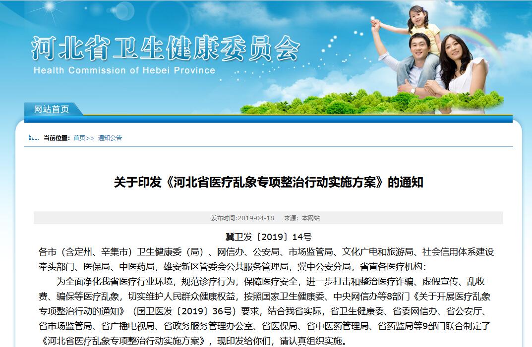 日前,河北省卫生健康委、省委网信办、省公安厅等9部门联合印发《河北省医疗乱象专项整治行动实施方案》,从今年4月到2020年2月,我省将在各级各类医疗机构开展医疗乱象专项整治行动,重点整治投诉举报多、问题突出的医疗机构。