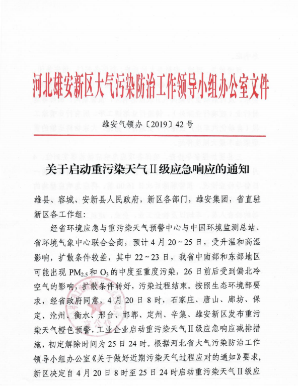 4月19日,雄安新区大气污染防治领导小组办公室发布《关于启动重污染天气Ⅱ级应急响应的通知》,决定自4月20日8时至25日24时启动重污染天气Ⅱ级应急响应。