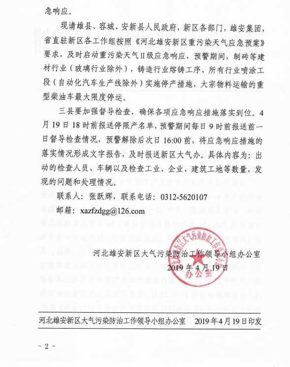 4月19日,河北雄安新区大气污染防治领导小组办公室发布《关于启动重污染天气Ⅱ级应急响应的通知》,决定自4月20日8时至25日24时启动重污染天气Ⅱ级应急响应。