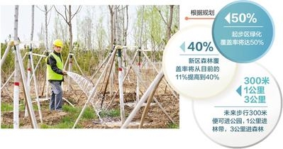 根据规划,新区森林覆盖率将从目前的11%提高到40%,起步区绿化覆盖率达50%。未来的新区,步行300米便可进公园,1公里进林带,3公里进森林,正可谓“人在大街小巷走,宛在风景画中行”。
