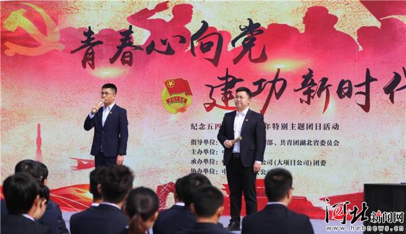 4月21日,“青春心向党· 建功新时代”纪念五四运动100周年特别主题团日活动在雄安市民服务中心举行。100名中建青年齐聚雄安新区,齐唱国歌、 团歌,重温入团誓词,讲述建设者在雄安的奋斗故事,唱响《我和我的祖国》。(赵龙)