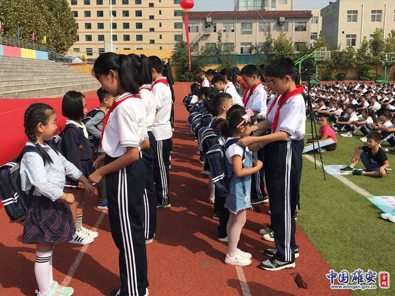 2018年9月12日,北京市朝阳区实验小学雄安校区的高年级学生帮刚入学的新生背上小书包。中国雄安官网记者封俊龙 摄