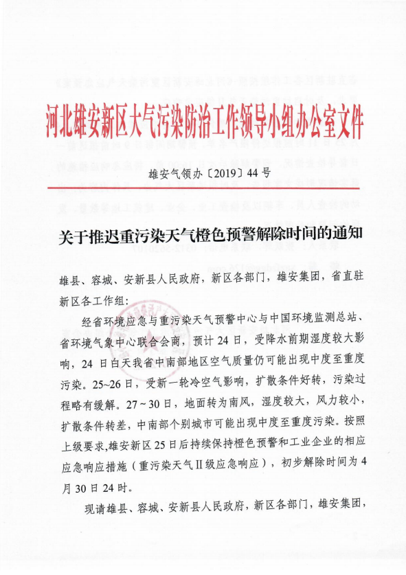 河北雄安新区大气污染防治工作领导小组办公室发布关于推迟重污染天气橙色预警解除时间的通知