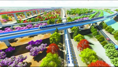 新机场线与新机场高速、京雄高铁形成的共走绿廊,将打造三季有花、四季常绿的特色景观。(效果图)北京市重大项目办供图