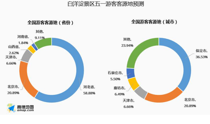 来自高德地图旅游大数据显示,在到访白洋淀景区的游客中,预计近六成游客来自于河北省,两成来自于北京市。此外,还有少部分来自天津、山西、河南的游客。