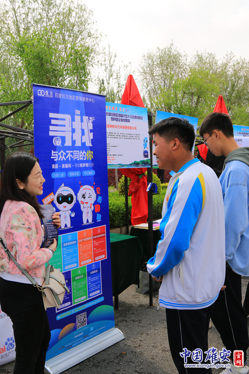 来自石家庄二中雄安校区(原安新中学)的高二学生在上午也加入到了求职者的队伍中,这些身穿校服的青少年出现在招聘会上令记者有些疑惑。一位学生在接受采访时说:“班主任老师带着我们来这里近距离感受一下招聘会的情况,从10点15到11点半,不耽误正常上课。我在这里看到特别多的工作职位都要求说普通话,平时我说家乡话多,以后要把普通话练好。”另一位女同学说:“我对人工智能行业特别感兴趣,不过有的岗位我觉得工资低一些,有的岗位还得需要一年以上工作经验,我上了大学想往这个方向努力。”