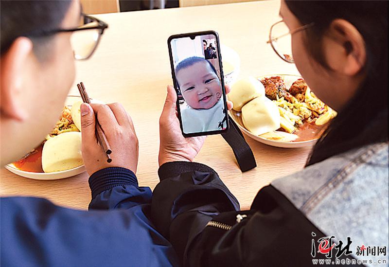 项目部的一对夫妻利用午饭时间和他们7个月大的宝宝视频。