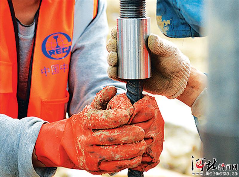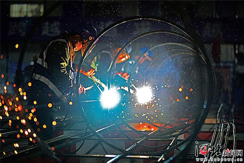 工人正在连接钢筋笼。雄安站桩基总数超7000根,每根桩基需要3个钢筋笼连接在一起。