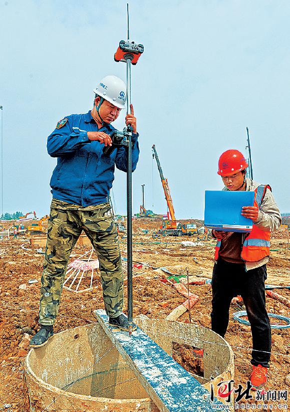 技术测量员刘刚(左)在对即将开挖的桩基进行定位。