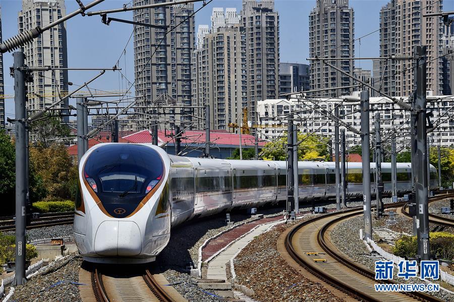 5月1日,一列京津城际动车组列车驶出天津站。 当日是“五一”小长假第一天,各地铁路迎来出行高峰。新华社发(杨宝森 摄)
