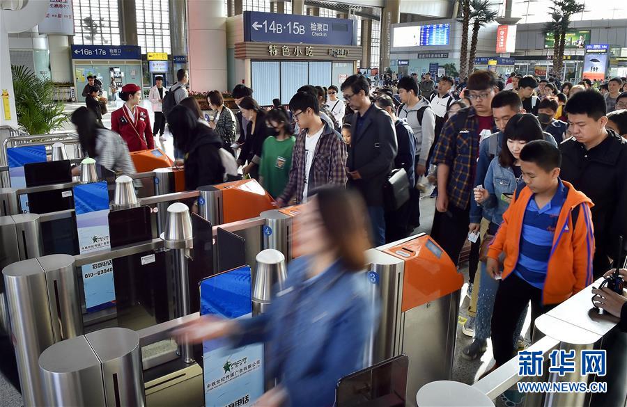 5月1日,旅客在天津站候车大厅检票乘车。 当日是“五一”小长假第一天,各地铁路迎来出行高峰。新华社发(杨宝森 摄)