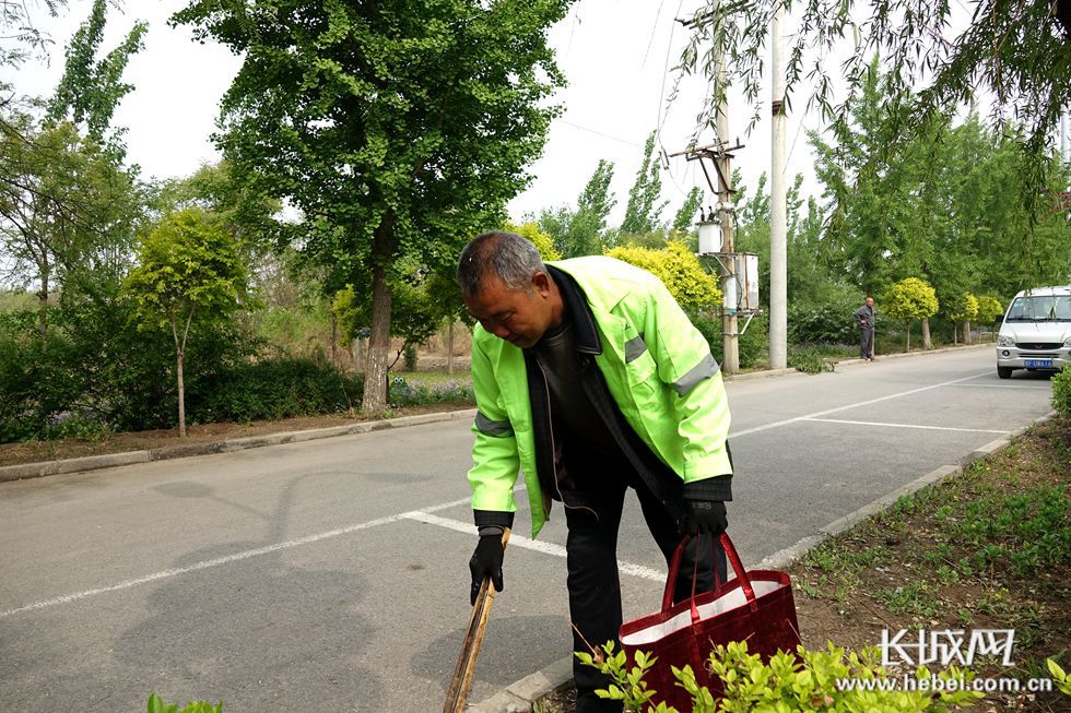 5月1日,在容城县大水大街旁,一名环卫工人正在清扫街头垃圾。霍少轩 摄