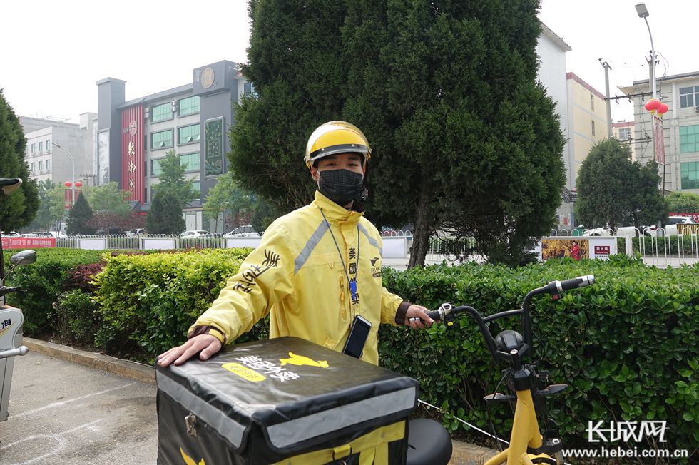 5月1日,在容城县奥威路旁,外卖小哥正准备去送打包好的外卖。霍少轩 摄