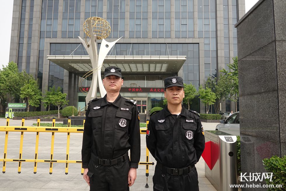 5月1日,在容城县奥威大厦门口,两位保安员正在值班。霍少轩 摄