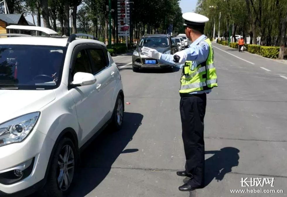 5月1日,在安新县白洋淀景区,执勤交警在指挥交通。霍少轩 摄